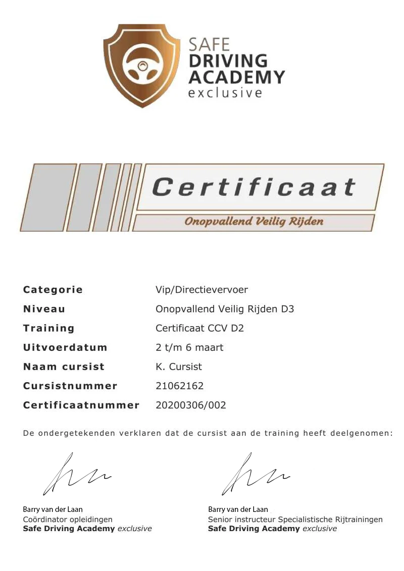 Alle trainingen die door Safe Driving Academy worden gegeven hebben tot doel een bijdrage te leveren aan de verdere ontwikkeling van de kennis en vaardigheden van de deelnemers aan de trainingen. De trainingen dragen dan ook direct bij aan de "Noodzaak van het leven lang blijven leren " en zijn door het CCV gecertificeerd voor de applicatiedagen van het CCV D1 en D2.
